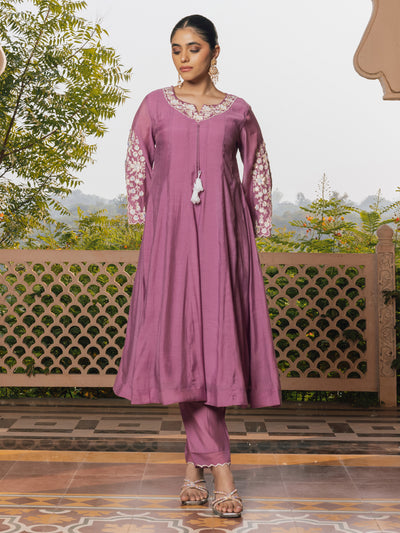The Kairavi Mul Chanderi Embroidered Suit Set offers serene elegance in a sophisticated Dusty Lilac hue. Crafted in lightweight Mul Chanderi, the fabric provides a comfortable drape and refined festive appeal. The long-sleeve kurta features a chic keyhole neckline, beautifully highlighted with delicate threadwork or trim that adds a subtle touch of artistry. Paired with coordinating straight pants and a matching dupatta, the regular fit ensures ease of movement and a polished silhouette. Ideal for evening gatherings, cultural events, or refined festive occasions, the Kairavi Set pairs beautifully with pearl drop earrings and silver-toned heels for a look that is both modern and gracefully understated.
