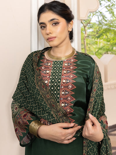 The Kavya Natural Crepe Embroidered Suit Set offers serene sophistication in a beautiful deep green hue. Crafted in fluid natural crepe with a soft butter crepe lining, this set provides an elegant drape and ultimate comfort. The long-sleeve kurta features a classic round neckline, highlighted by delicate tonal threadwork and subtle embellishments across the yoke, creating a refined festive sparkle. Paired with streamlined straight pants and a coordinating dupatta, the regular fit ensures ease of movement throughout your celebration. Perfect for festive gatherings, cultural events, or evening functions, the Kavya Set is best styled with oxidized silver jhumkas and metallic embellished flats for an understated yet polished finish.